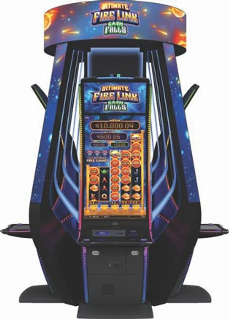A special gold Ultra Fire Link fireball on a full reel triggers the Ultimate Fire Link spin. The reel array expands to eight symbols on all reels, and all fireballs are held as cash-on-reels symbols for a re-spin.