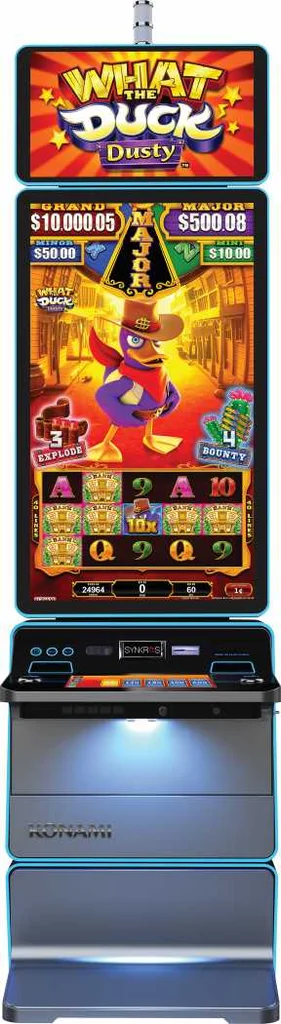 This is a fun new game available on Konami’s two large-format cabinets, the Dimension 49 (49-inch monitor) and Dimension 75C (75-inch monitor). There are two base games, What the Duck Dusty and What the Duck Snowy.