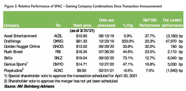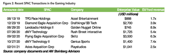 Since the end of 2019, there have been several examples of gaming companies using SPACs to go public instead of doing an IPO. The most notable of these was DraftKings, which went public roughly a year ago and has been one of the best-performing stocks during this time period. Other reported SPACs that appear on the horizon include Sportradar, reportedly valued as high as $10 billion.