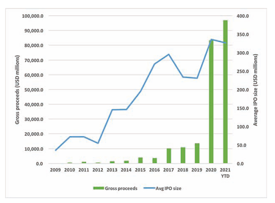 For the year to date ended March 31, 2021, approximately 297 SPACs have completed their IPO, raising over $97 billion in proceeds. For comparative purposes, there was a record 248 SPAC IPOs with $83 billion in proceeds for the entire year 2020. Thus, through one quarter of 2021, the number of SPAC IPOs and proceeds has exceeded all of 2020. In fact, the 2021 YTD SPAC issuance has exceeded the number of IPOs and proceeds for the 11 years from 2009 through 2019 combined.