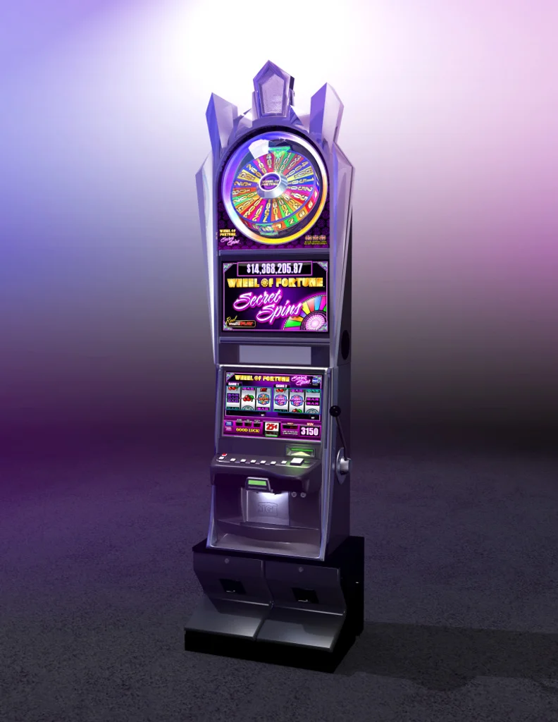 When playing only one game, the bonus feature is the same as the original three-reel, single-payline Wheel Of Fortune game. A bonus symbol on the third reel on the payline initiates a spin of the wheel. The top box wheel spins once, and when it stops, the pay aligned with the indicator is awarded and the bonus ends. When both games are played, the traditional Wheel Of Fortune bonus may initiate in the first game, but a second “Secret Spins” bonus may also initiate on the second game, awarding one of the multipliers on the outer edge of the wheel in addition to the wheel bonus. The top box wheel tilts on its axis and spins to stop on one of the multipliers, which range from 1X to as high as 31X.